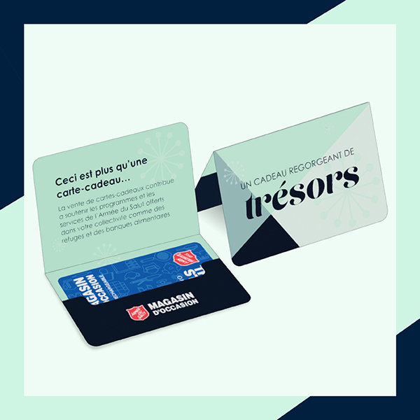 Offrez aux gens que vous aimez un cadeau qui leur permettra de se faire plaisir et de redonner à la collectivité. Nos cartes-cadeaux permettent aux détenteurs de faire des trouvailles fabuleuses ET de soutenir les programmes et les services offerts par l’Armée du Salut. Afin de personnaliser ce cadeau socio-écoresponsable, que diriez-vous de confectionner un joli porte-carte?